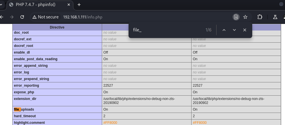 /info.phpresource and found thatfile_uploadswas enabled. - Identified technologies such as Bootstrap, jQuery, and HTML5 on the web server.